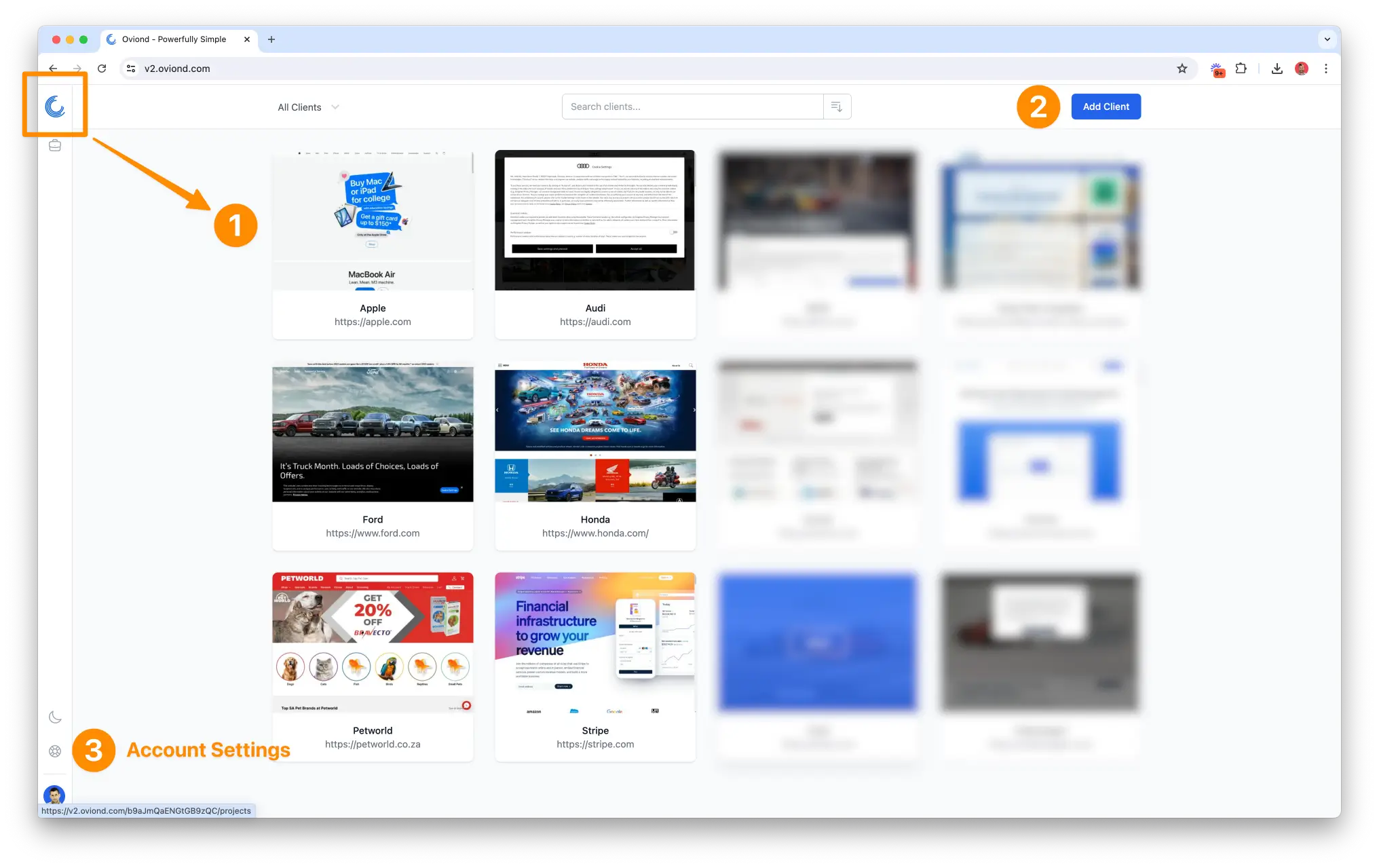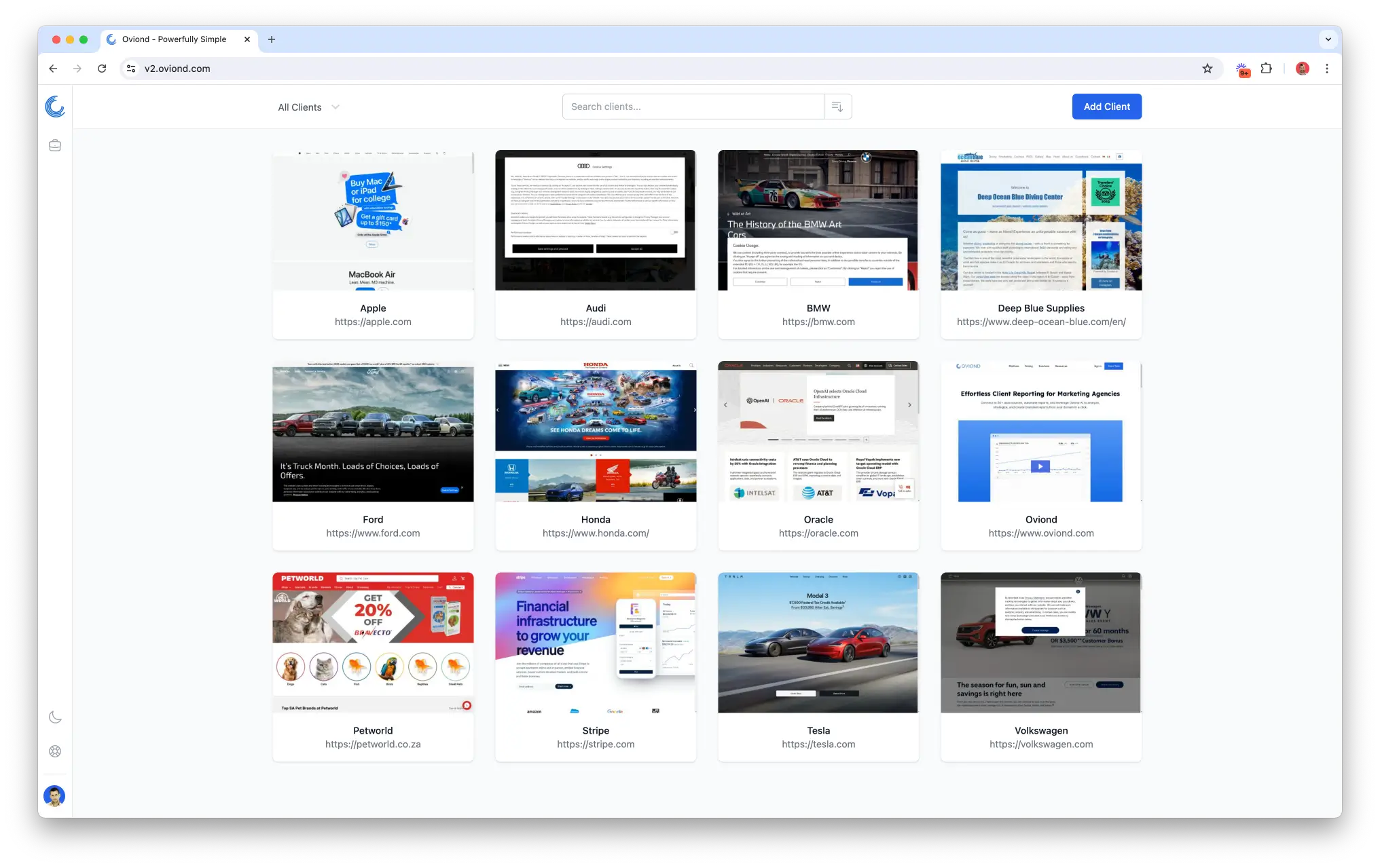 From this page, you can add new clients, search for existing ones, select multiple clients for bulk actions, create and add to a folder, edit a client name and access Oviond’s Agency Tools.